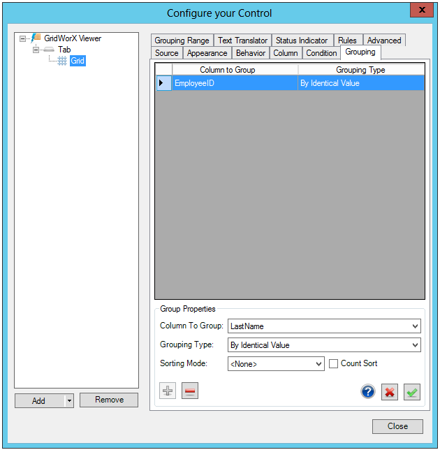 Use the GridWorX configurator's Grouping tab to select the criteria on which to group columns in your grid. You can also select the type of grouping to include (e.g. by identical value).