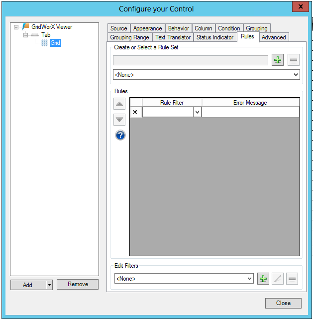 In the Rules tab, you can specify a list of rules that can be associated with a grid. These rules will be checked when the user applies the changes. If the data does not respect one or more rules, the associated error message(s) will be visualized and the applied operation will be cancelled.