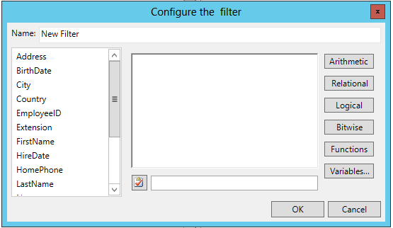 If you click on the plus sign [+] in the Edit Filters section of the window, it will open the Configure the filter window, shown below, which allows you to add commonly used elements (Address, BirthDate, City, etc.) or expressions (Arithmetic, Relational, Logical, etc.) to use for filtering. Click OK when you've finished configuring the filter to return to the Configure your Control window.