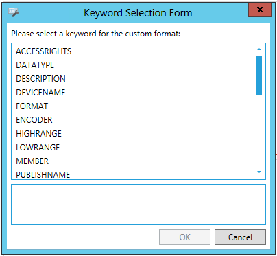In the Keyword Selection Form Window, you can select a keyword for the custom format, based on the properties being set. For instance, you can use the Keyword Selection Form Window for: