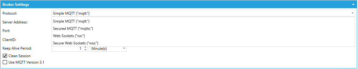 Within the Broker Settings section, a user can specify new protocols. These new options are Web Sockets (“ws:”) and Secure Web Sockets (“wss:”).