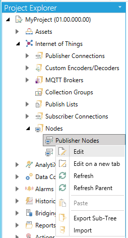 In the Workbench, expand your project in the Project Explorer, then the Internet of Things branch, and then the Nodes branch, to show the Publisher Nodes sub-branch. Right click on Publisher Nodes, as shown below and select Edit.