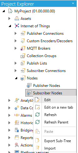 In the Workbench, expand your project in the Project Explorer, then the Internet of Things branch, and then the Nodes branch, to show the Subscriber Nodes sub-branch. Right click on Subscriber Nodes, as shown below and select Edit.