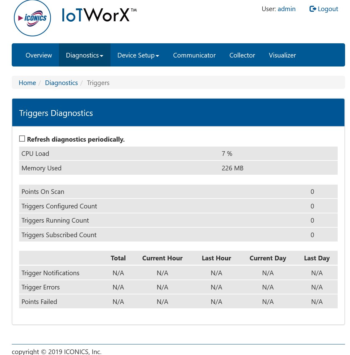 The Triggers page of the IoTWorX Diagnostics, shown below, provides multiple statistics on connected application triggers.