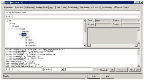 - Browse for iso > org > dod > internet > mgmt (1.3.6.1) which is the root OID available on every SNMP device and try to resolve the data by clicking on Start. You should get results similar to the figure below.