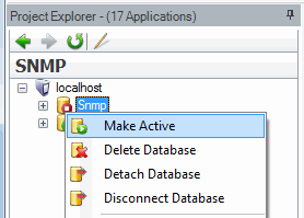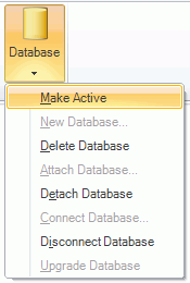 Right-click on the database icon and select Make Active. If the Make Active selection is grayed out, then the current database is already the active database. You can tell which database is currently active by the nearby icons: Active (