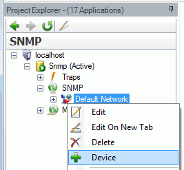 Right-click on a network folder within the SNMP tree control of the SNMP Connector and select Device from the pop-up menu, as shown in the figure below.