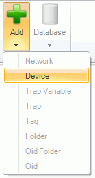Select a network folder within the SNMP tree control then click on the Add button in the Edit section of the Home ribbon at the top of the screen in Workbench64, then click on Device.