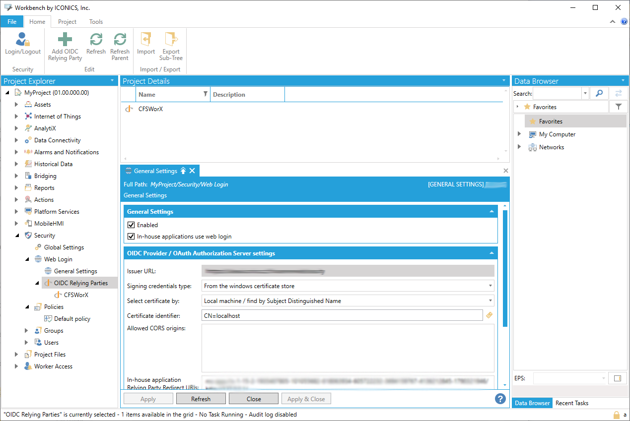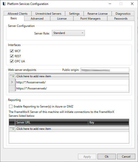 In Platform Services, make sure you fill in the “Public origin” with the protocol and host name where the service will be accessible from the outside. This step is important, because the IdentityServer must be able to provide endpoint discovery at https://<host_name>/fwxserverweb/security/.well-known/openid-configuration.