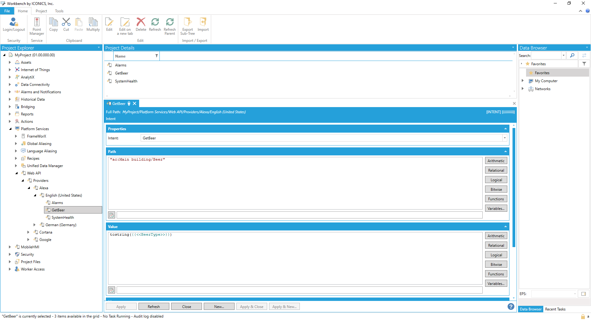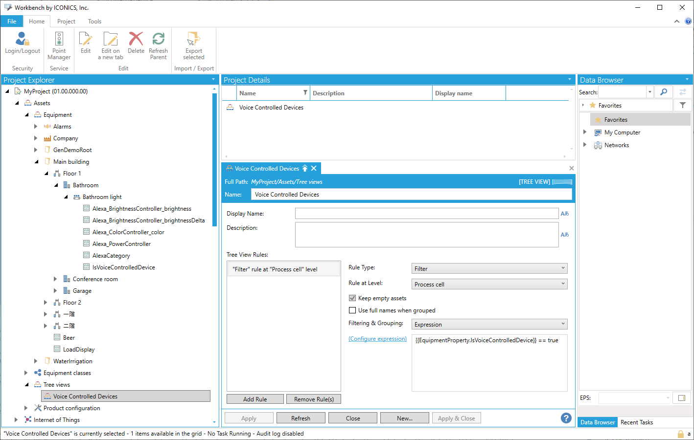 The AssetWorX configuration is based upon virtual trees. Default configuration in the IcoAlexa.json, IcoBots.json and IcoGgl.json uses ac:.Tree Views/Voice Controlled Devices/. This default configuration requires each asset that represents a voice-controlled device to have an asset property called IsVoiceControlledDevice of Boolean type and value set to True. This default configuration can be changed for each plugin in its *.json config file.