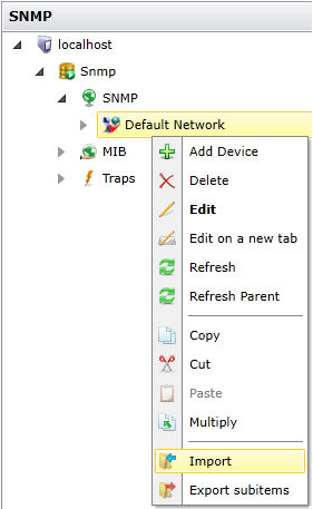 Right-click on an item in the SNMP Connector's Project Explorer. This can include a database, network, or folder level of the SNMP Connector Project Explorer. Select Import from the menu.