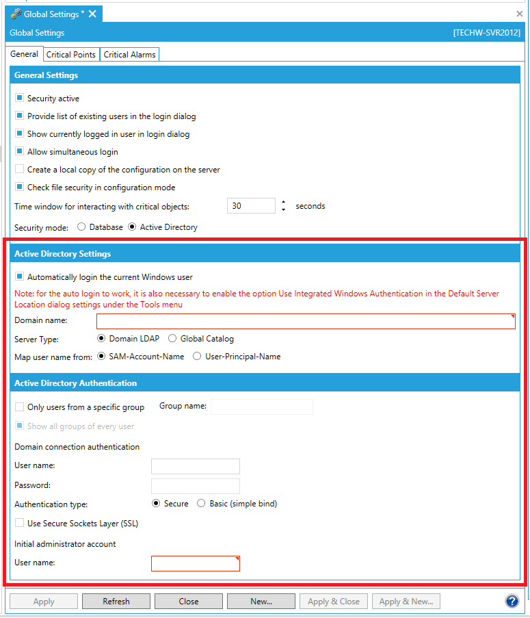 GENESIS64 can use either the Active Directory or the ICONICS Security Server database for authenticating users. This is a Global Setting that applies to all uses, so that one and only one authentication method exists. If you select Database in the Security mode list box in Global Security Settings, then the latter system is used. Otherwise, select Active Directory to use single sign on Windows domain authentication. The figure below shows these settings.