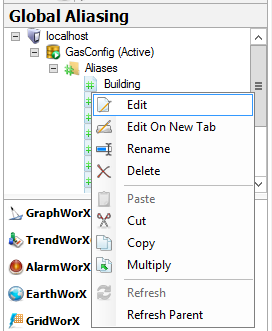 You use the Global Aliasing Configurator to create global aliases and assign them the parameters you desire. Alias names can contain aliases themselves, which are resolved during GENESIS64 application runtime. In this section the most common operations for global aliases are described. When configuring global aliases, first select the database you wish to use and if necessary right click on that database and select the Make Active command from the context menu. Expand the database node to view any aliases or themes you have already created and stored.