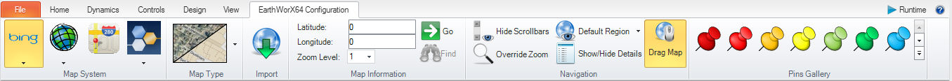 The EarthWorX Configuration ribbon has the following sections. Click on the hyperlinks below to see more information about sections of the ribbon.