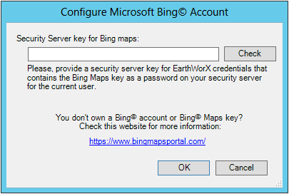 Select the Bing option to set up a Bing maps connection. The Configure Microsoft Bing Account menu will then appear. Enter the Security Server Key to initiate the connection.