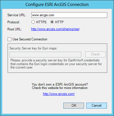 Select the ESRI option to set up an ESRI connection. Enter the Service URL and select the protocol type (HTTPS or HTTP). Next, enter the Security Server key for Esri maps and select OK to initiate. To sign up for an account or free trial, go to http://www.arcgis.com/about