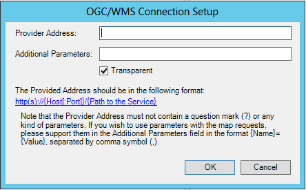 Select the OGC/WMS option to set up a OGC/WMS maps connection. Enter the Provider Address and any Additional Parameters, then select OK to initiate. To sign up for an OGC account, go to www.ogcnetwork.net.