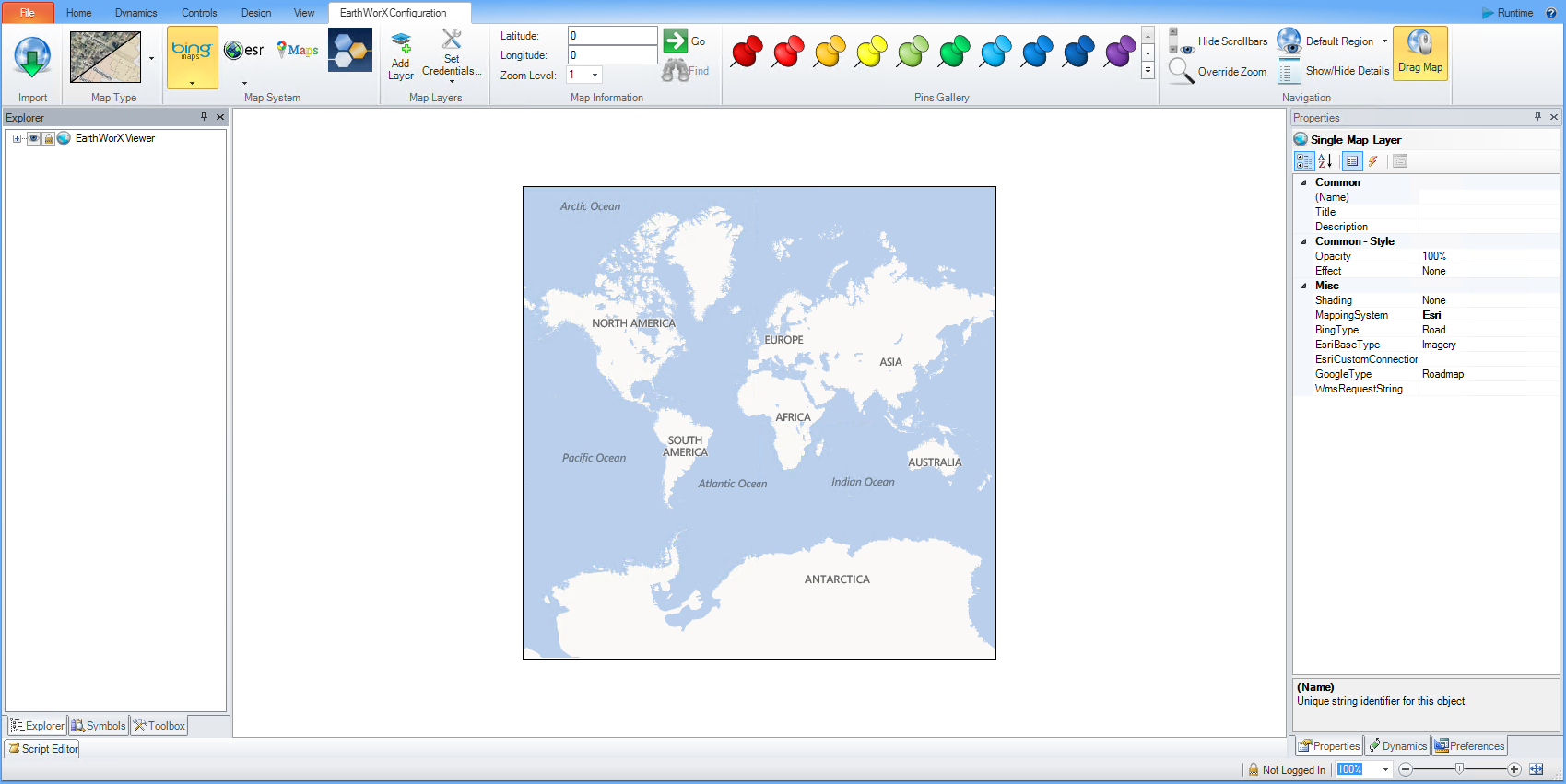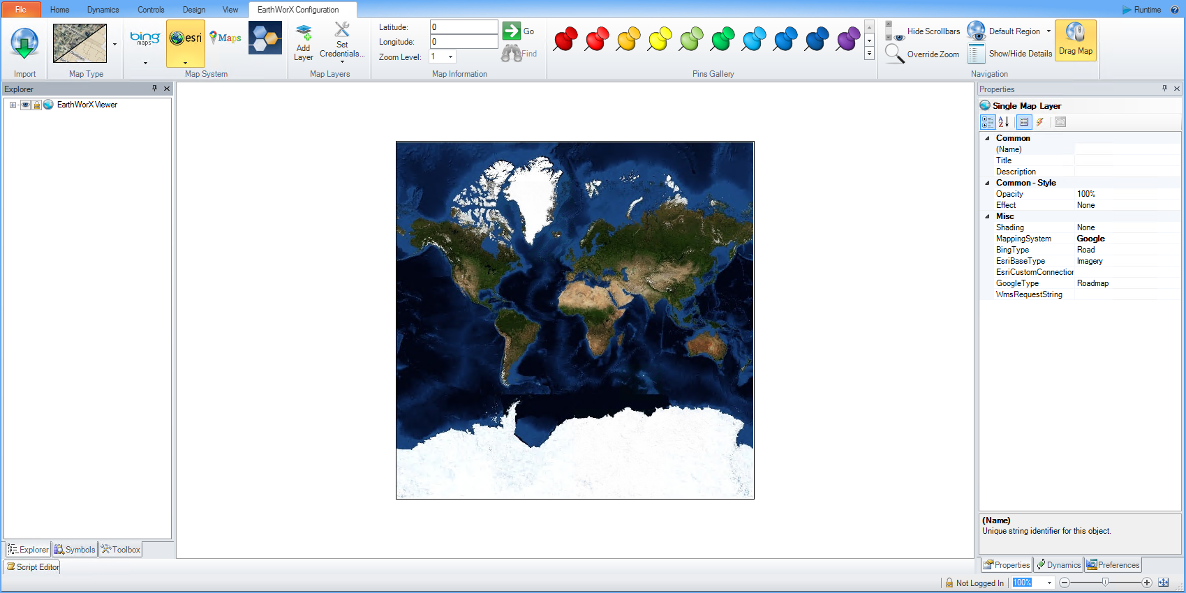 The Map System section of the EarthWorX Configuration Ribbon allows you to select which database your maps are being provided through. The Map System provides the user with 4 different options of map systems: Bing (default), Esri, Google, and OGC/WMS. Each option is described below along with options available for each system. For more information about the unique map types available for each system, please see Map Type.