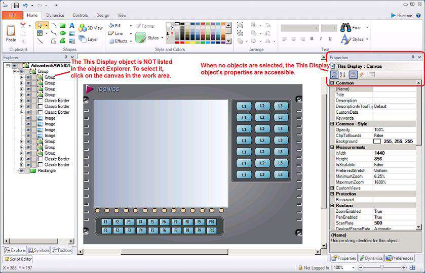 GraphWorX64 uses a hierarchical object scheme for object creation and inheritance. When you create new display you start off with the This Display object into which all other GraphWorX64 objects are contained. You can also add a GraphWorX64 viewer control to a display and doing so creates another This Display object inside the viewer control.