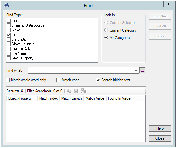 · Find what - Specify the desired text, including tags, object names, or file names of symbols. Click the ellipsis button to open the Data Browser to help you. The Data Browser can be helpful when entering a search string that is composed of a complex path to a data source or some other string that is difficult to enter precisely or remember. Use additional filters such as Match whole word only and Match case to further limit results.