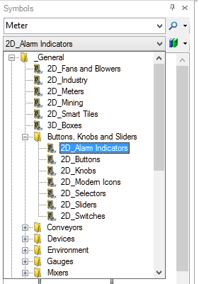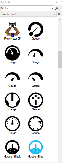 A user can quickly find the symbols needed for a particular display by entering search terms into the text box located near the top of the Symbol Library tool. Search terms are associated words and descriptions that help find the desired symbol. Search for symbols by name, function, industry, color, and style. When using multiple search terms, the sequence of the search terms will not affect the search results (e.g. searching for "2D Yellow Pipe" will yield the same results as "Pipe 2D Yellow"). Select the search button (magnifying glass) or press the Enter key on the keyboard to search for symbols with the associated search terms. The symbols currently-opened category or currently-shown set of search results auto-save whenever a search operation is initiated.