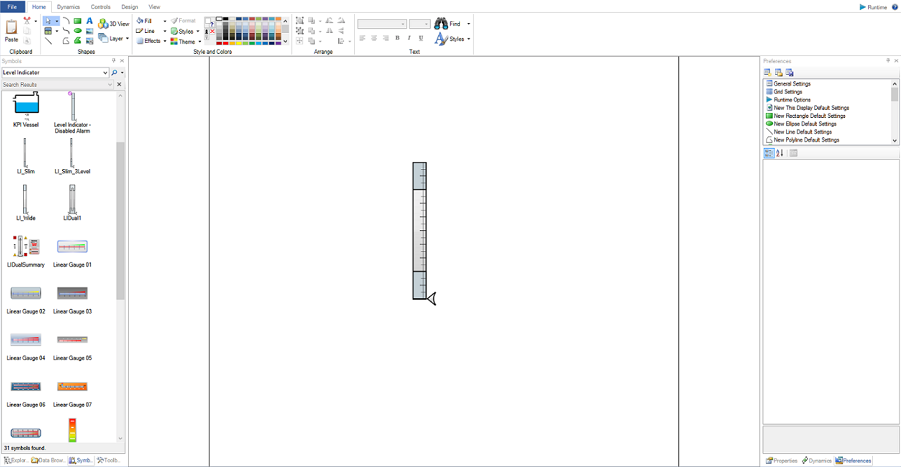 The Symbol Library is available in GraphWorX64 while in Configuration Mode. It can be freely floating or docked to any side of the display: left, top, right, or bottom, as shown in the figure below. You can show and hide the Symbols Library by using Symbols check box in the Show/Hide section of the 2D GraphWorX64 View tab.