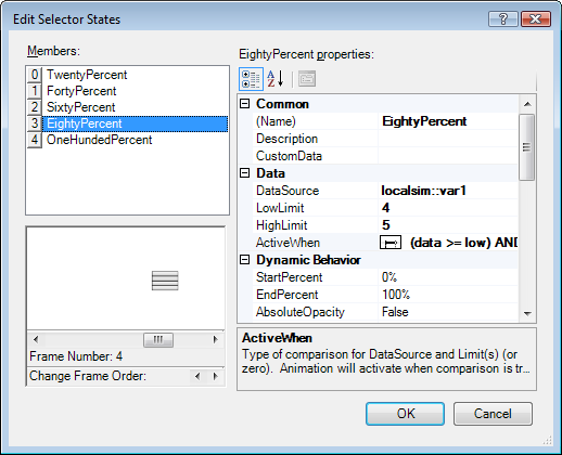 Set the State Selector dynamic's DataSource property to localsim:var1; then click the States property to open the Edit Selector States dialog box as shown in the figure below.