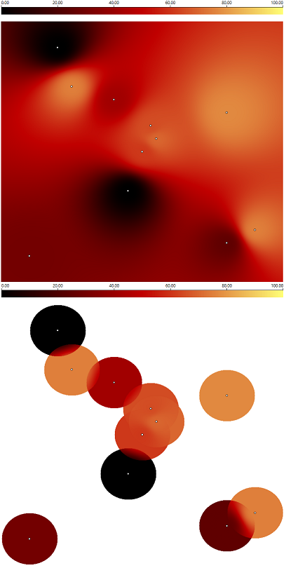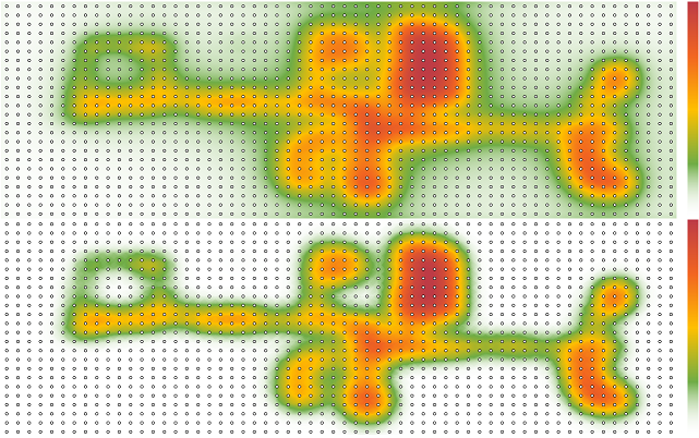 However, this next dataset contains enough samples to fully cover the entire heatmap in a grid. The top heatmap has a minimal value of 0, whereas the bottom heatmap has a minimal value of 0.1. As you can see, there is not as much difference between the two images. With this well-populated dataset, a minimal value of 0.1 can be visually acceptable and provides better performance than 0.
