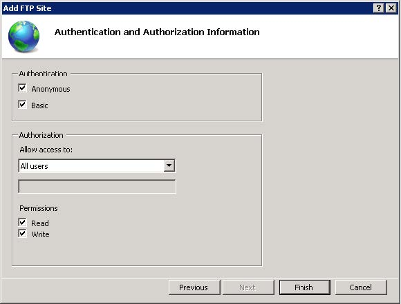 In the Authentication, check Basic. Set the Authorization to All Users, and allow Read and Write permissions. Click Finish.