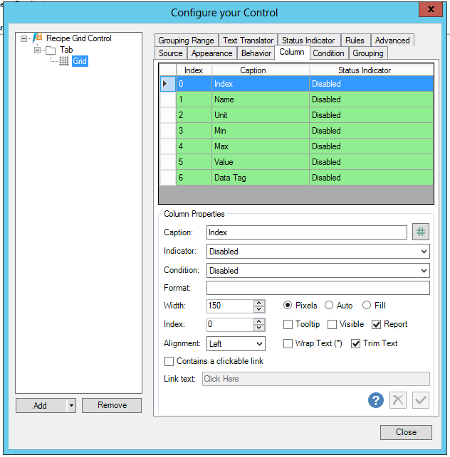 Contains a clickable link - Click this checkbox if the column will contain a clickable link. Once checked, you can then enter the link the in the Link text text entry field.