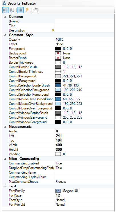 The right side of the screen will now display the Security Indicator Control Properties. Security Indicator Controls have a number of standard properties such as Measurements and Text, but also have a number of unique properties.