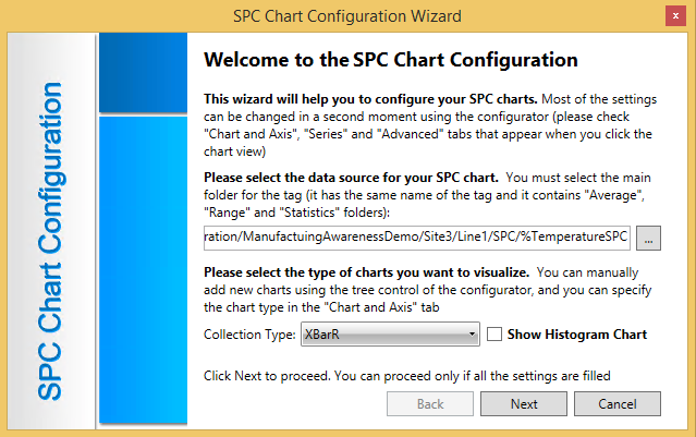 NOTE: Three charts will be created – SpcPrimary showing Average, SpcSecondary showing Range and Statistics with Histogram Chart (Data source path of each chart is automatically adjusted to point to proper data).