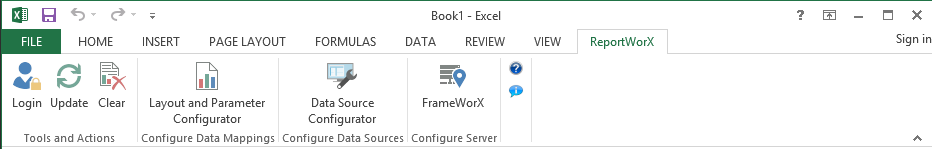 When using ReportWorX Express, you interact with a special, context-sensitive tab on the Microsoft Excel ribbon labeled ReportWorX64. When you select this ribbon tab, the following options appear: