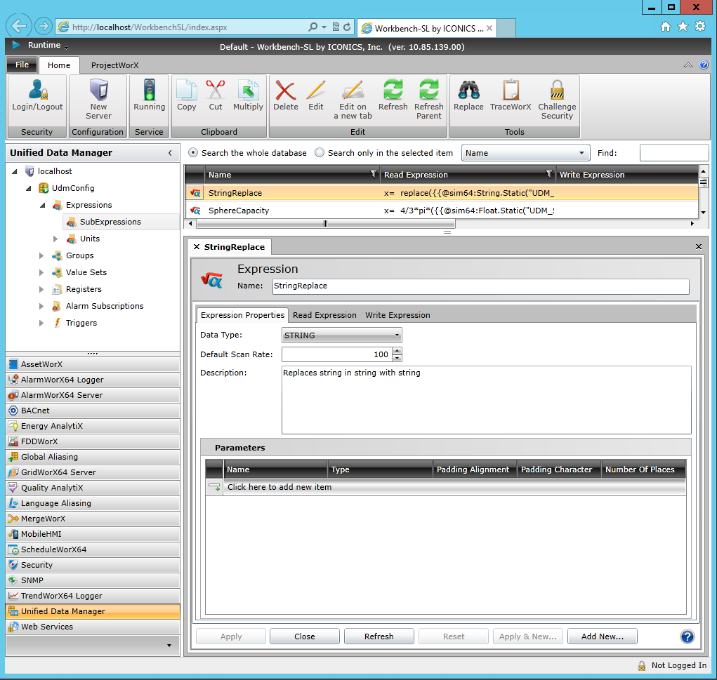 The Unified Data Manager enables the centralized management of commonly used expressions, value sets, tag groups, alarm subscriptions, and triggers across GENESIS64 products as well as other ICONICS products. From the Workbench configuration interface you can create libraries of reusable expressions, value sets, and other functions. The Unified Data Manager provides time-saving, on-the-fly selections and modifications of commonly used functions, saving integration and applications development time.