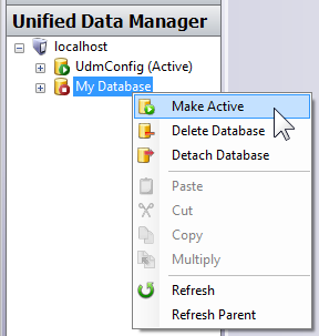 When you have two or more databases, only one can be active. To change which database is active, right click on the database node and select the Make Active command, as shown in the figure below. The green database icon for the active database replaces the red database icon for the inactive database. Command for Make Active, New Database, Delete Database, and Attach and Detach Databases can also be found in the Database button menu in the Edit tab group of the Home ribbon.