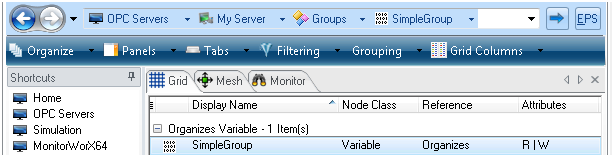 Grouping allows you to write a single variant value to a group of data tags. Each group of tags is represented by a group data tag. Group data tags are organized in a tree structure of folders and group items. Since each group is represented as a data tag, a group data tag may also be included in other groups. Group values are written synchronously to target OPC servers.