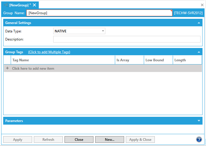 Parameters are client-driven, and they do not change the number of requested data tags in runtime. Parameters can replace parts of data tag names by values passed in the group data tag name. Each parameter can be an integer or a string data type with optional formatting. If you had a number of models of a certain type and wanted to add a description to the front of each model number, you could do so with a parameter. Each data tag may support parameters) that could modify names of the data tags. Each parameter can be integer or string data type with optional formatting.