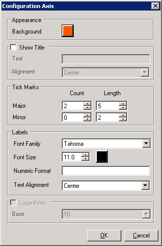 The Chart Elements tab includes the color of lines and backgrounds, as well as how the different Axes are displayed. You can also alter the ranges that a multi-plot display uses on this tab. In runtime, when you click the Show/Hide Axis button this same tab is displayed as a dialog box. These settings apply to Configuration mode, Runtime mode, and Freeze Mode.