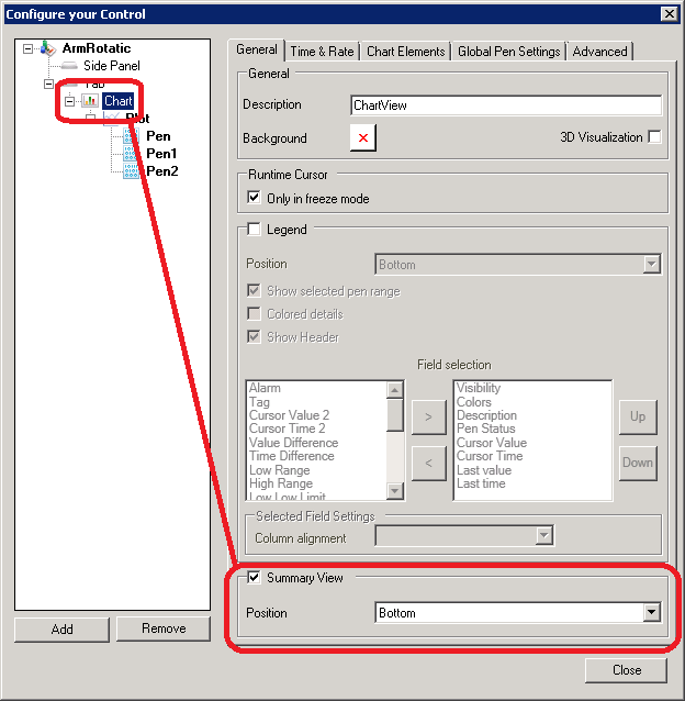 Summary View: Selecting this check box displays a summary plot underneath the trend plot that shows values during the entire time that data is being collected. The Summary View shows only in Freeze mode. If the chart will display this view, also specify the position of this view (either on Top of the chart or on the Bottom of the chart). During Freeze mode, below the Summary is a cursor that runtime users can manipulate as a way of showing data changing over time. For a runtime example, refer to the Summary View topic.