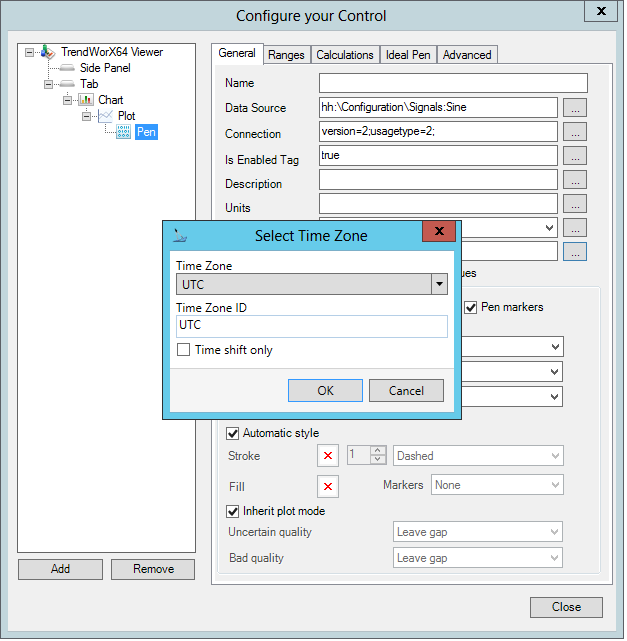 The TrendWorX64 Viewer's Time Zone Synchronization feature allows the user to visualize data from different time zones across the globe as long as they are aligned to the local time. This lets the user compare their values based on the date and time regardless of the location in which the data is recorded. Each Pen can define its own Time Zone in TrendWorX64 Viewer, however, Time Zones defined in the Pen's configuration override the original Time Zone data source. Time Zones can be configured using the Time Zone ID or Time Shift. When using Time Shift, regional time adjustments such as daylight savings time do not apply. Each Time Zone is automatically retrieved from a data source, granted that the data source information is provided before hand.