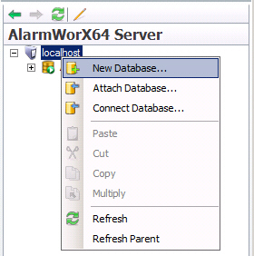AlarmWorX64 Server creates the new database file which should automatically appear in the tree control. If the database name does not appear within a few seconds, click the Refresh