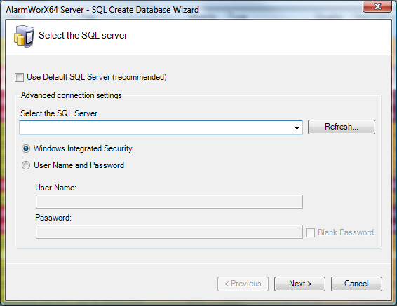 In the AlarmWorX64 Server - SQL Database Wizard Select the SQL Server step, select Use Default SQL Server (recommended) or deselect that option and Select the SQL Server from the drop-down list. If you select the Select the SQL Server you will need to select the security option for accessing the database either: Windows Integrated Security (which is recommended) or User Name and Password. If you choose User Name and Password enter the User Name: and Password: in the text boxes.