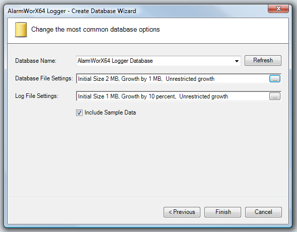 When you install AlarmWorX64 , it creates a default SQL database for you to use. The Configurator provides a Configuration Database Wizard for creating new SQL Server and SQL Server Express configuration databases for AlarmWorX64 Server.
