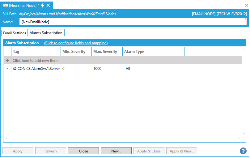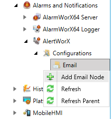 Start the Workbench, then expand your project. Next, expand the Alarms and Notifications node to show the AlertWorX node. Expand the AlertWorX node to show the Configurations node. Expand the Configurations node to show the Email node.