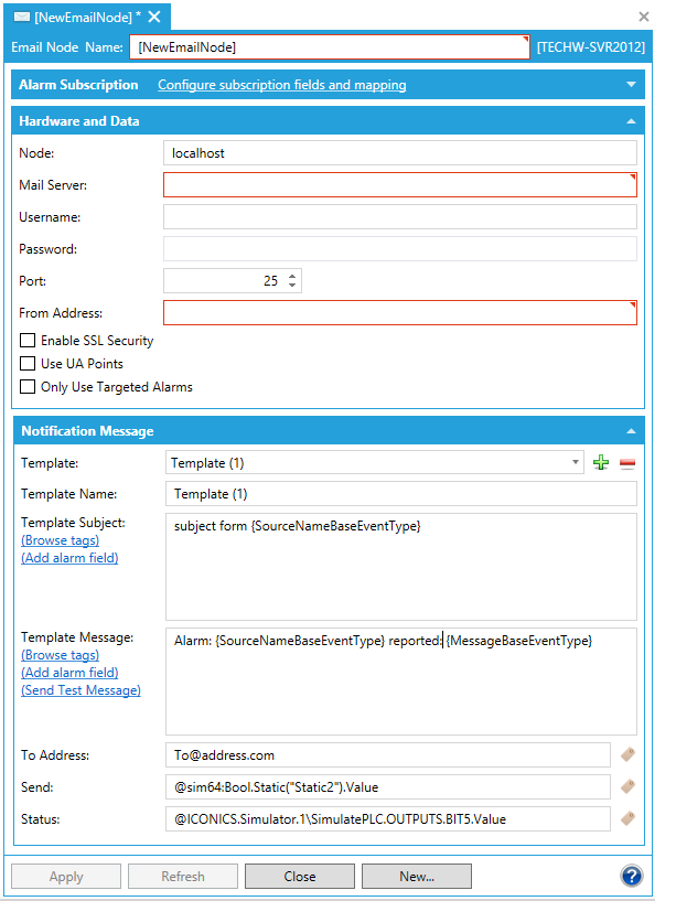 In the Hardware and Data sections, you can enter the Node name of the Alert Email Service in the text entry field. Next, enter the Mail Server to connect to. Provide the Username and Password for the mail server, as well as a Port number. In the From Address field, enter an email address recognized by the mail server. Click the Enable SSL Security checkbox if the mail server requires an SSL/TLS security connection. Click the Use UA Points checkbox when Notification Message Fields are loaded as data points. Click on Only Use Targeted Alarms if flagged alarms are to be used. Alarms are flagged by adding flags to alarms in the alarm server. If the Receive commands on this node checkbox is checked, this node will receive commands from the client.