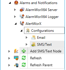 1. Start the Workbench, then expand your project. Next, expand the Alarms and Notifications node to show the AlertWorX node. Expand the AlertWorX node to show the Configurations node. Expand the Configurations node to show the SMS/Text node.