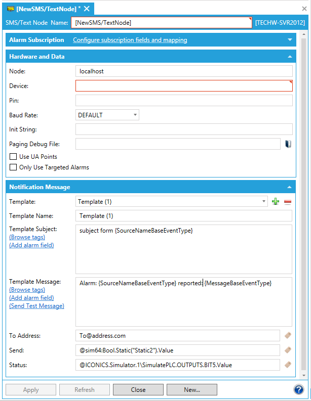 (Send Test Message) link to test the hardware settings. Note that you must have the Node, Subject, Message and To Address fields set correctly in order for the test message to work.