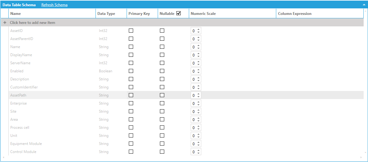 The data schema lists the AssetPath column (which is our hierarchical column) and the individual levels (Enterprise, Site, Area, etc.). Individual levels can be accessed by name in the same way as DateTime levels.