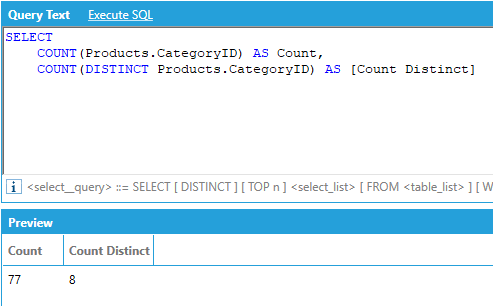 AnalytiX-BI supports calculating aggregates over only distinct values of a specific column by adding the DISTINCT qualifier before the column name inside the aggregate function, for example: