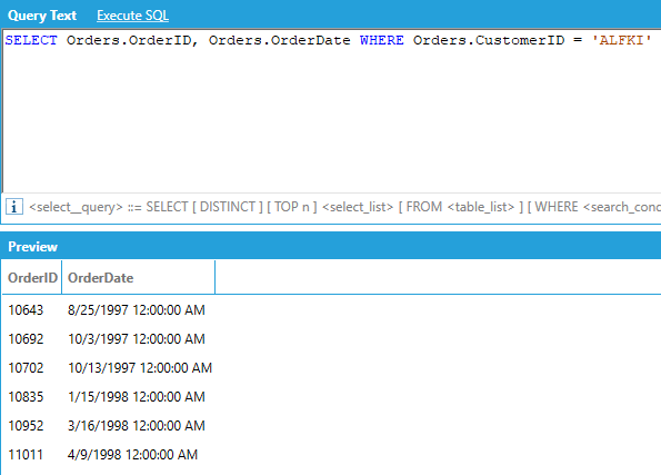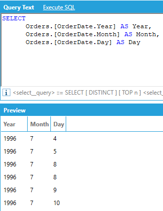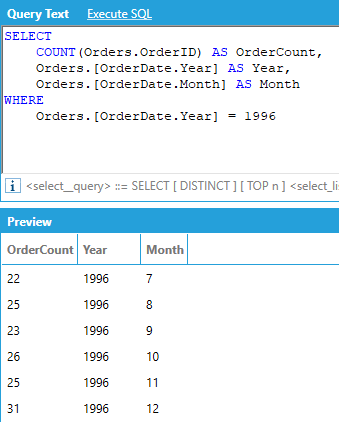 As usual, we don’t need explicit JOINs or the FROM keyword, as AnalytiX-BI can automatically compute them based on columns involved in the query.